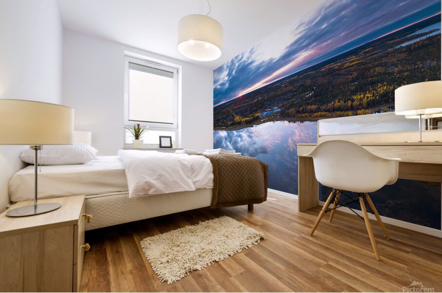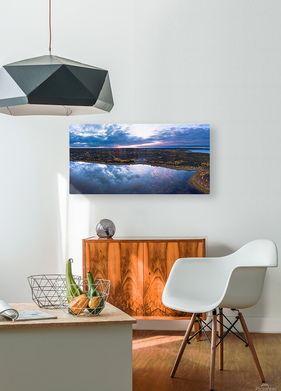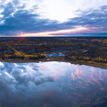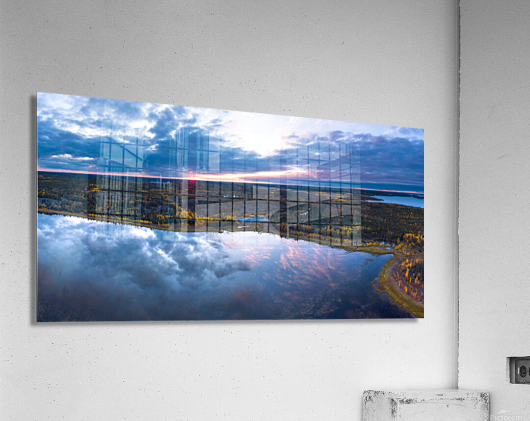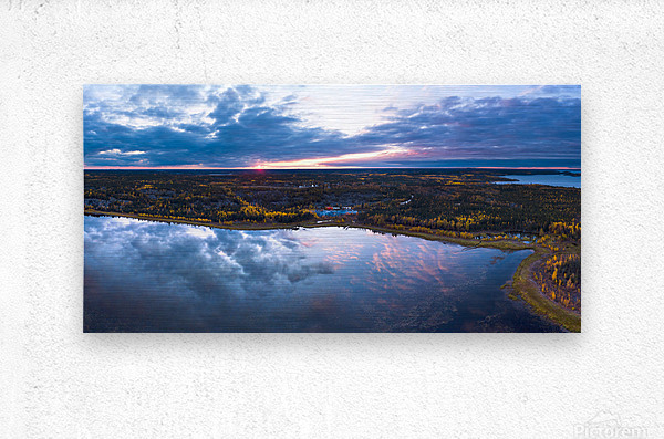 A panoramic birds eye view of the fall reflections near Cassidy Point with Aurora Teepee Village in the distance.