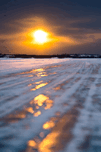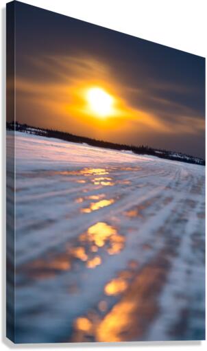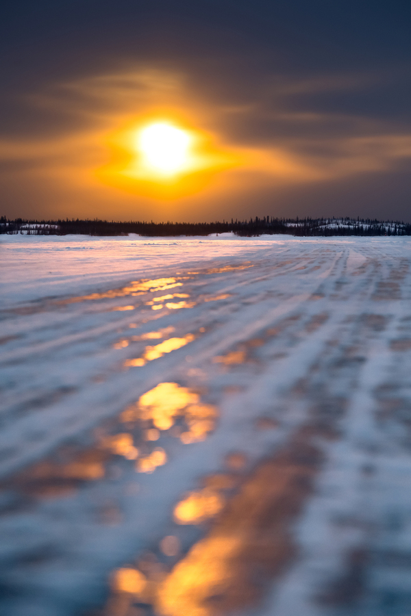 The serene stillness of the frozen lake during winter is nothing short of mesmerizing, casting a spell of quiet wonder. When the sun emerges over the Dettah Ice Road, it orchestrates a breathtaking spectacle, as if nature itself is painting a surreal masterpiece in the sky.