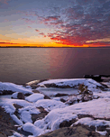 Capturing the tranquil beauty of Tu Nedhé (The Big Lake): A long-exposure masterpiece showcasing the glistening icy waters along the shoreline, where a brilliant sunrise paints the sky in vivid hues.