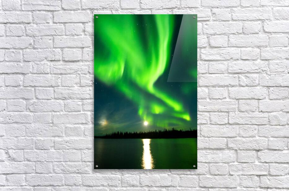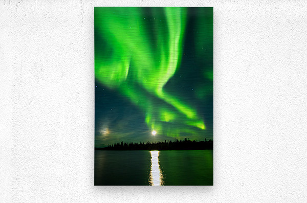 A night to remember: The full moon takes center stage as the auroras paint the sky in vibrant hues above Prelude Lake East. Enjoying this cosmic display from a friend's dock is pure magic.
