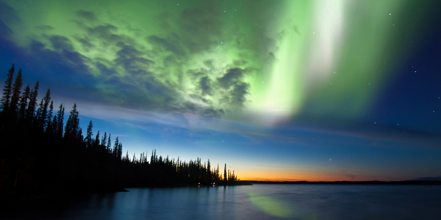 Amidst the tranquil setting of Prelude Lake, the waning sun ignites the sky after a warm fall day, while the auroras burst forth in a vibrant, electrifying display.